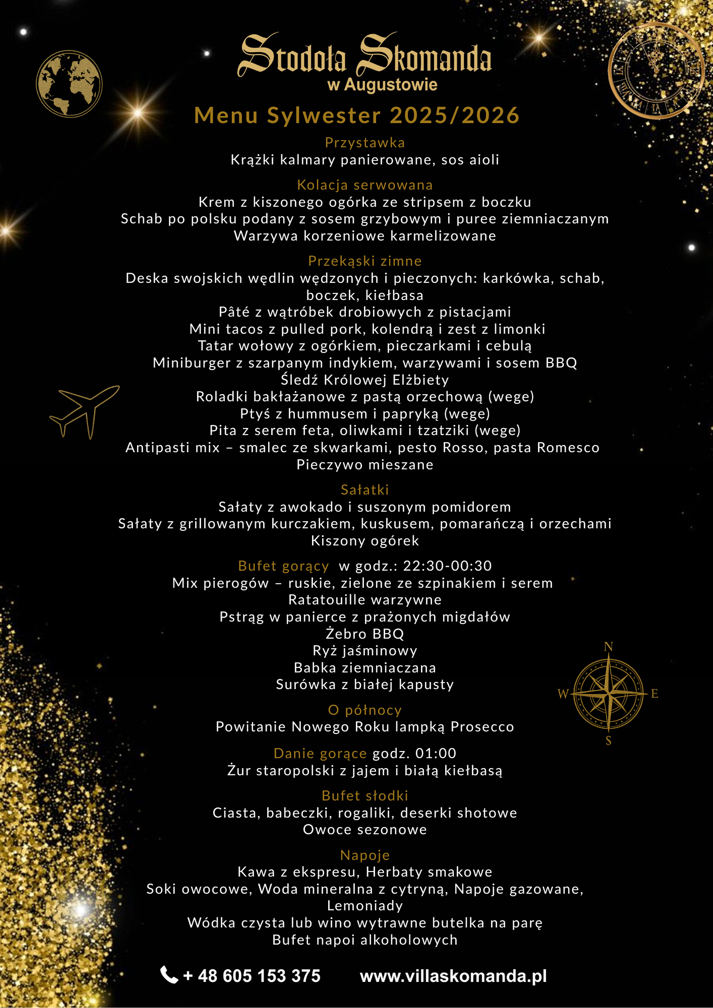 Powitaj Nowy Rok w pięknej zimowej scenerii Augustowa i Puszczy Augustowskiej. W programie ognisko i relaks w tradycyjnej saunie. Dla chętnych spływ kajakowy. Zabawa Sylwestrowa podróż bez paszportu – muzyka, kuchnia i zabawa z różnych stron świata. Swoboda, Smak, Przygoda.
